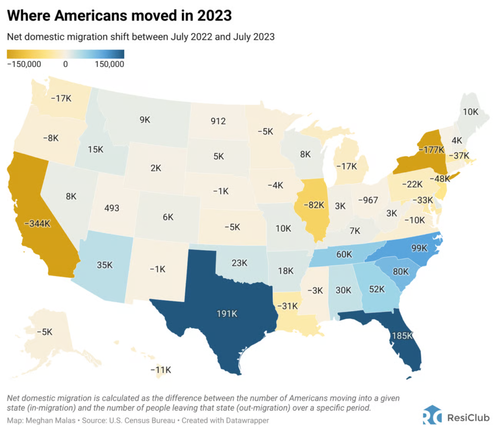 Yet several of these states are now seeing net out-migration. According to the U.S. Census Bureau, states like California and New York are registering substantial population losses. (ResiClub Analytics)